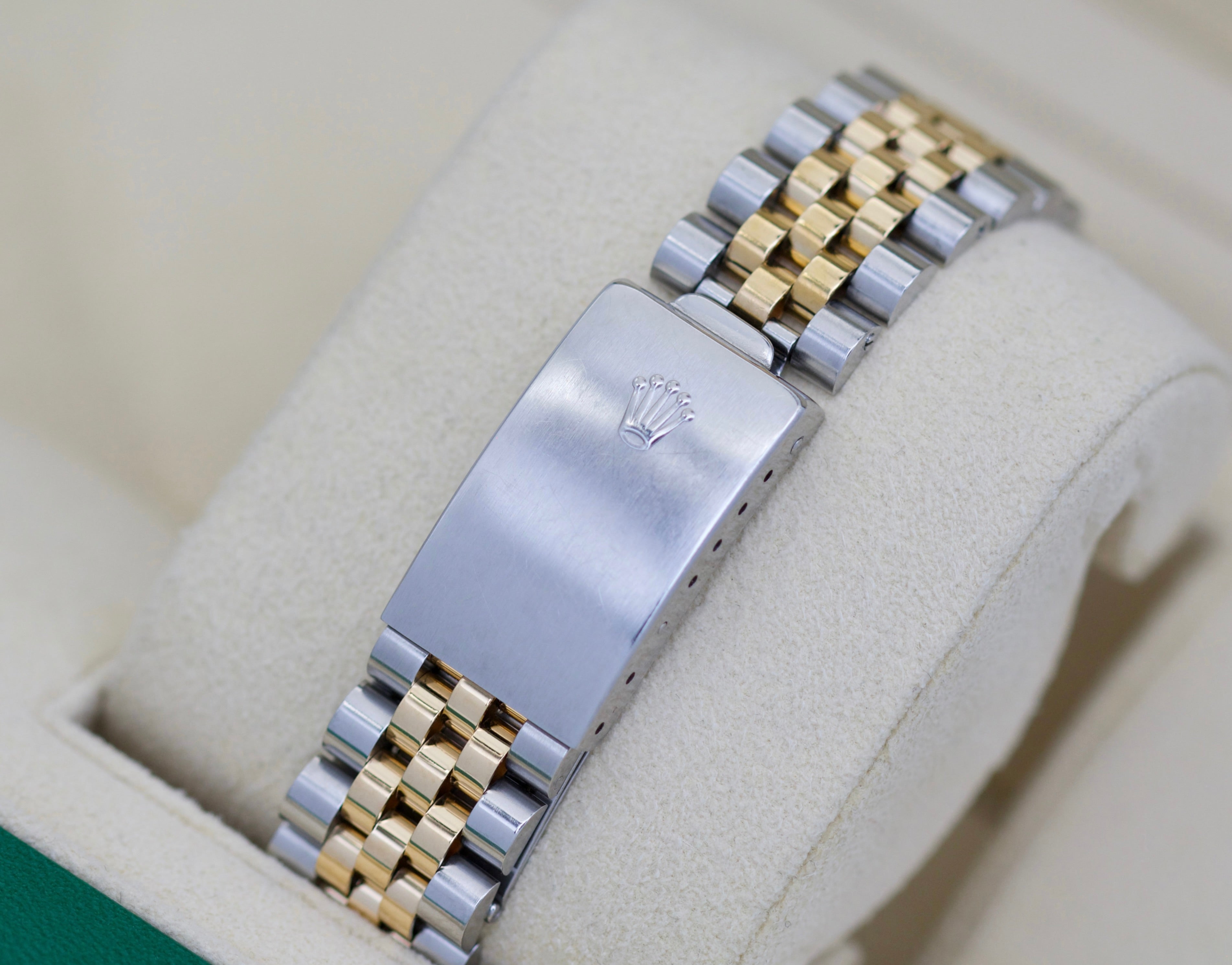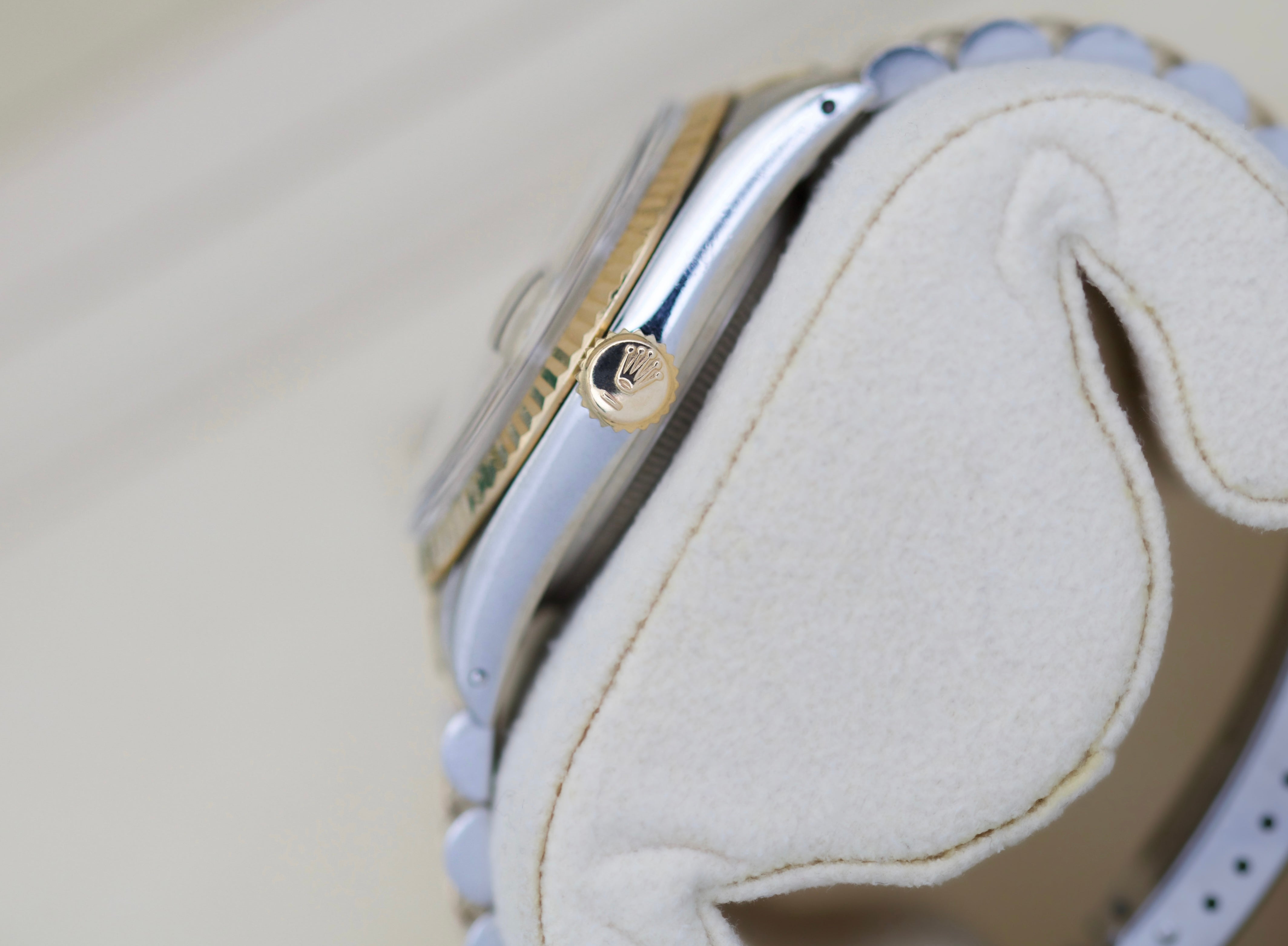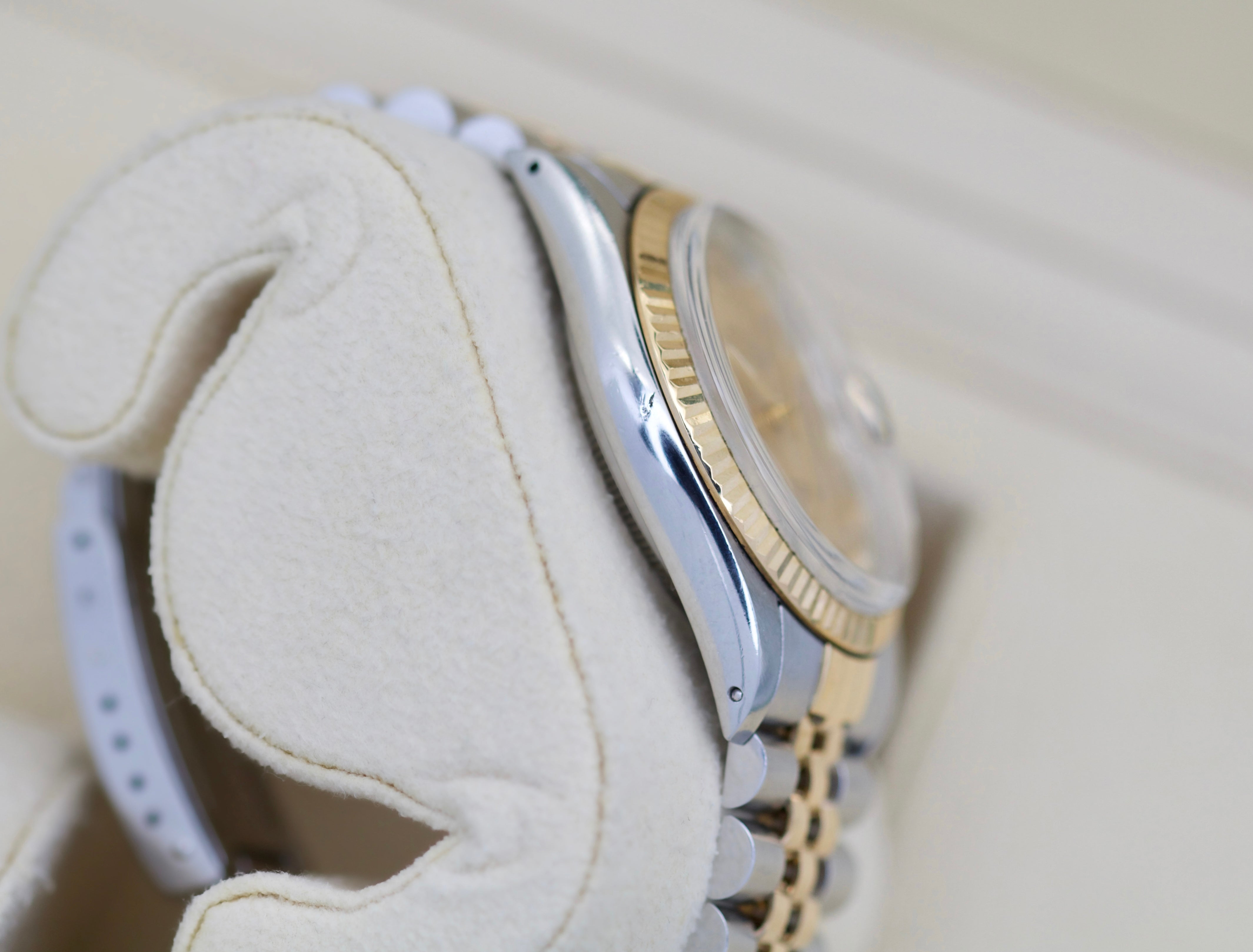 En eksklusiv Rolex Datejust two tone med en nydelig gullfarget diamantskive.
